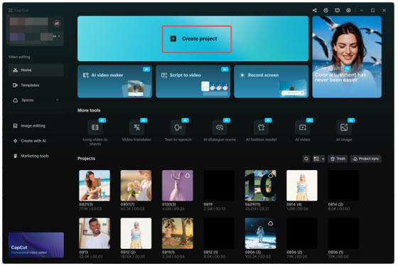 Install CapCut and log in. Click on the button Create project to create a workspace to store your blog images.