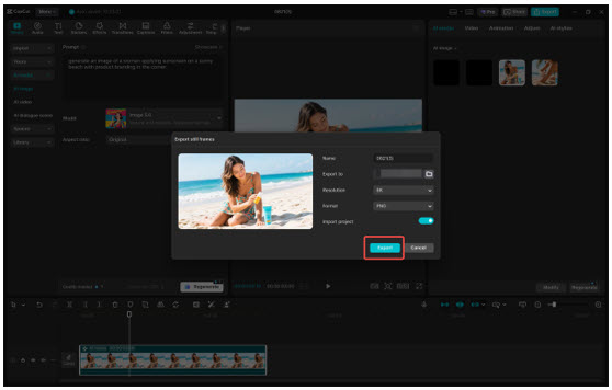 Click the three horizontal lines above the preview panel, click on the "Export still frames," give it a project name, select the resolution (4K or 8K) and click on the Export button. Your image can now be used in your blog, in social media or in your promotional campaigns.
